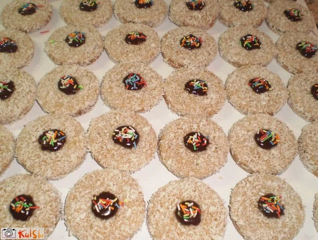 Ko so piškoti pečeni, jih po dva skupaj zlepimo z marmelado. Tudi zunanjo stran namažemo z marmelado in jih povaljamo v kokosu. Na koncu še okrasimo s čokolado in pisanimi mrvicami.