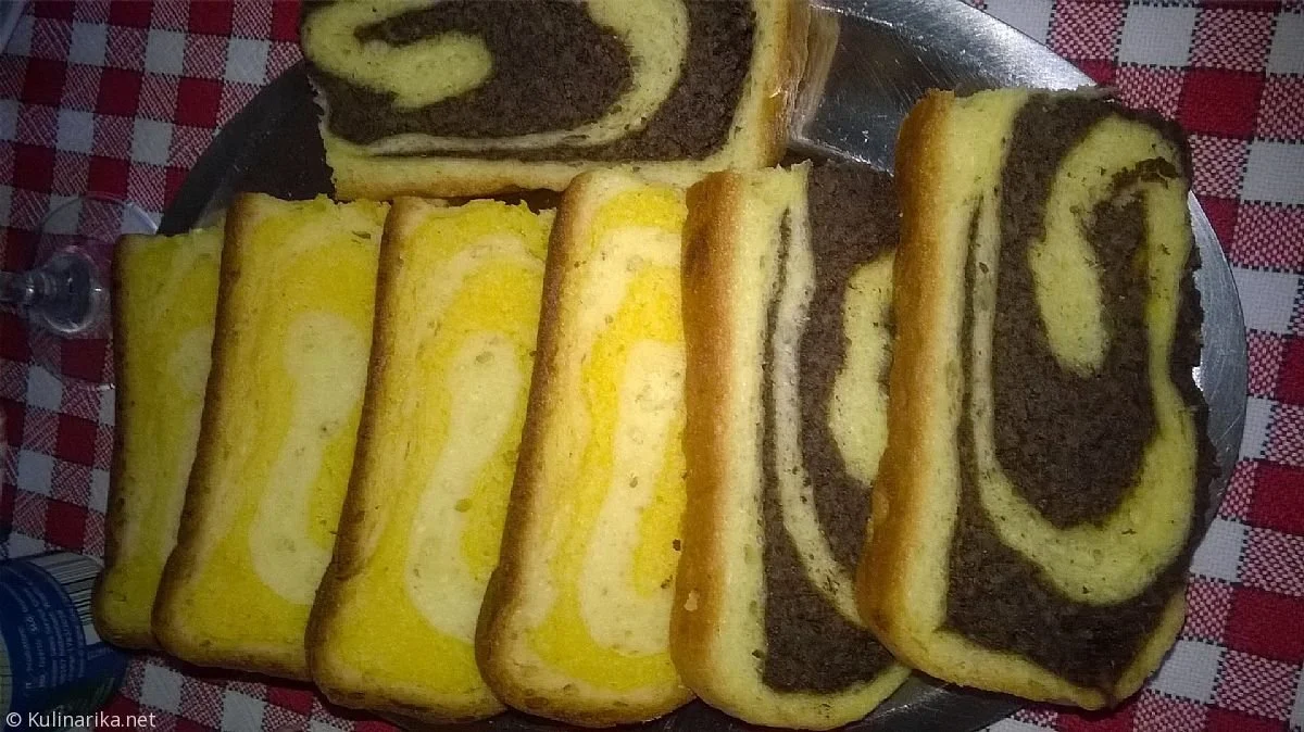 4. Testo namažemo z nadevom, zvijemo, pri tem malo testo zategujemo, ga prešpikamo in pokritega vzhajamo cca. 45 minut. Preden ga damo v pred ogreto klasično pečico, ga premažemo s stepenim jajcem. Pecite, kot sem navedla v opombah.