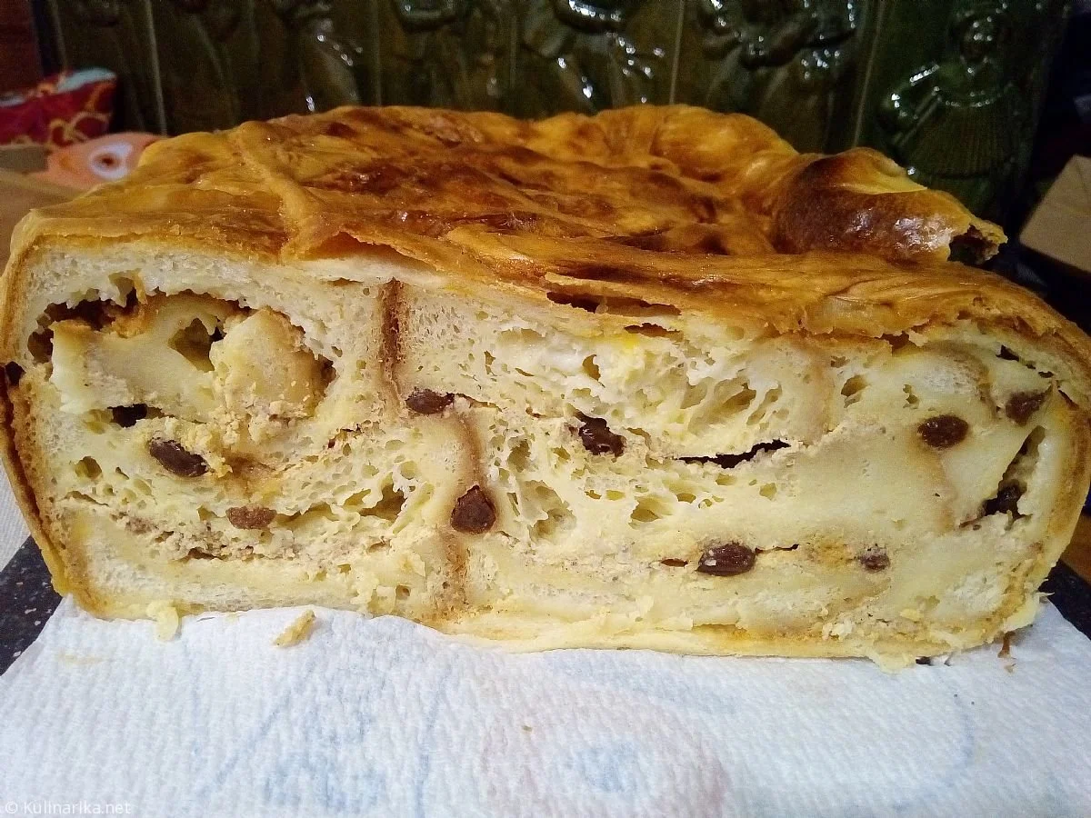 2. Vlečeno testo razvlečemo in ga položimo na namaščen pekač tako, da visi čez robove. Nanj položimo rezine kruha, ki smo jih namočili v mleku ter prelijemo s pripravljeno polivko iz smetane in skute. Potresemo z rozinami. Vse skupaj ponavljamo, dokler ne porabimo vseh sestavin. Na vrhu naj bodo kruhove rezine.