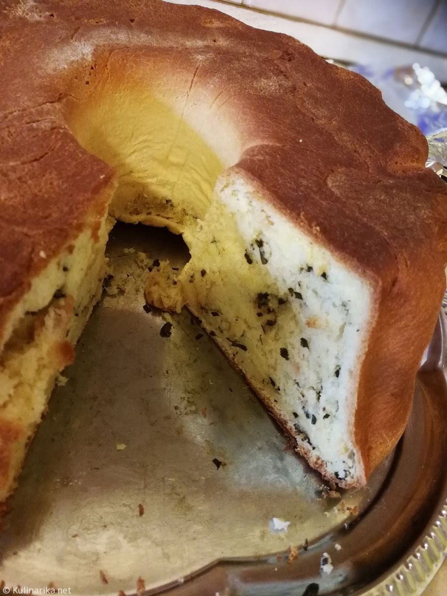 Kruh narežemo na kocke in ga prepražimo na maslu. Ohlajenemu dodamo sladkor, 3 jajca, kislo smetano in tik pred mazanjem še sneg beljakov. Premažemo čez testo in posujemo s pehtranom. Zavijemo in preložimo v pekač ter pustimo, da vzhaja. Pred peko testo prepikamo s palčko za ražnjič in damo peči. Pečemo na 180 stopinjah 45 minut.