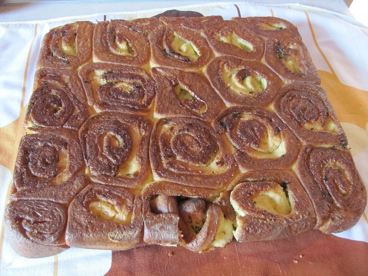 2. Ko je testo vzhajano, ga na pomokani podlogi razvaljamo dobre pol centimetra debelo in premažemo z nadevom. na vrhu potresemo pehtran. Zvijemo in po širini narežemo na cca. 3 cm debele kose. Polagamo obrnjene z nadevom navzgor v dobro namaščen pekač (tisti od pečice) in pustimo vmes kak cm presledka. Ponovno vzhajamo.