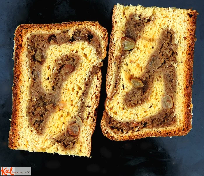 Testo razvaljamo na tanko (3 - 5 mm), namažemo z nadevom in potresemo z rozinami (prej jih čez noč namočim v rum) in suhimi orehi. Zavijemo in damo v pomaščen model. Pustimo vzhajati pol ure.