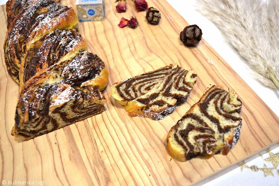 3. Vzhajano testo stresemo na pult, ga pregnetemo in pustimo počivati nekaj minut. Nato testo razvaljamo na pravokotnik, ga premažemo z nadevom, posujemo kandirano limonino lupinico in zvijemo v zavitek. Položimo ga na peki papir. Po dolžini ga z nožem prerežemo na pol, tako da se na eni strani zavitek še drži skupaj. Na tem delu začnemo oba nastala kraka potice med seboj prepletati. S pomočjo peki papirja prestavimo spleteno potico v pekač. Pustimo jo na toplem vzhajati.