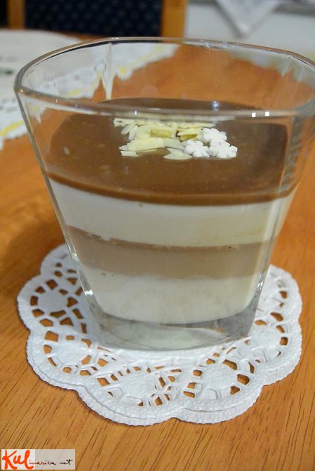 čokoladno panna cotto razporedimo po strjeni vaniljevi panna cotti in vrnemo za eno uro v hladilnik.