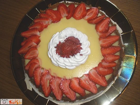 Ko se malce ohladi, zmes prelijemo s pudingom, ki smo ga naredili po navodilu z vrečke in pokrijemo z narezanimi jagodami.