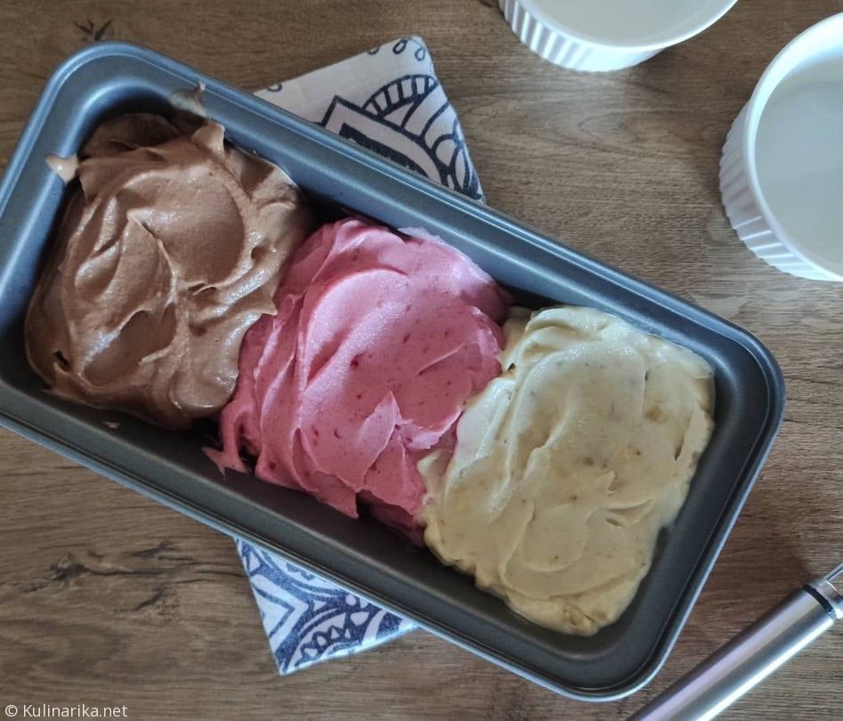 Čokoladni sladoled stresemo v posodo zraven malinovega in damo v zamrzovalnik.