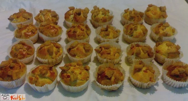 Iz testa oblikujemo 24 kroglic, jih damo v papirčke za mafine ter vse skupaj v pekač za mafine. Premažemo jih s stepenim jajcem in posujemo s preostankom ocvirkov. Pustimo jih vzhajati še 15 minut. V pečici ogreti na 200 stopinj jih pečemo 20 minut.