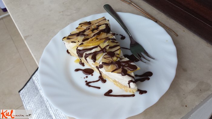 V posodi zmešamo skuto (najbolje je, če je ta pasirana) s sladkorjem in vanilijevim ekstraktom oz. vanilijevim sladkorjem. Po okusu lahko dodamo še rum in limono. Želatino medtem namočimo v vodi, ter jo, ko se strdi, raztopimo in dodamo skuti. Medtem v drugi posodi stepemo sladko smetano. Ko se skuta začne strjevati, ji le - to dodamo, še zadnjič premešamo in vlijemo v pekač na hruške in piškote. Torto po vrhu okrasimo s preostalimi lističi hrušk in jo damo v hladilnik za približno 2 uri (lahko jo položimo tudi v zamrzovalnik, ki pospeši strjevanje, vendar ne za dlje kot 1 uro, da torta ne bi zmrznila).