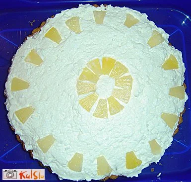 Oblat natopimo s sokom od ananasa in nadevamo s kremo med katero pomešamo ananas.