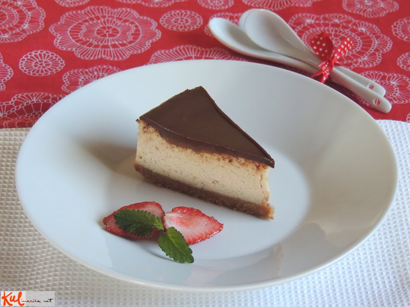 Vlijemo na piškotno dno in damo peči za dobro uro oz. dokler ni temperatura na sredini 75 stopinj. Medtem pripravimo ganache, smetano segrejemo, v vročo damo čokolado in premešamo, da se stopi. Rumenjak dobro razmešamo s soljo, nato pa mu dodamo čokoladno smetano. Cheesecake vzamemo iz pečice, pečico ugasnemo, nanj damo ganache in postavimo nazaj v pečico za 10 minut.