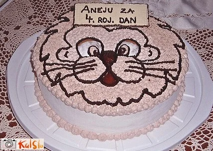 V smetano sem zmešala malo kakava v prahu (ne preveč da ni pol grenko), potem pa sem obrobila s čokolado. Oči in smrček pa sem malo izbočila s punčem.