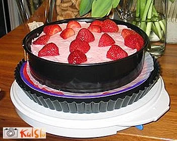 8. Kremo vlivamo v pripravljen model. Zelo atraktivno je, če med kremo dodamo še nekaj jagod (do 15 dag) in dokončamo premaz tako, da se jagode ne vidijo. Maso poravnamo na vrhu obroča z glazurnim nožem. Damo za 8 ur v hladilnik. Po 8 urah vzamemo zadevo iz hladilnika, odpremo obroč in ga dvignemo. Snamemo alu - folijo s kremastega valja in voila, torta je narejena. Po vrhu jo okrasimo s celimi jagodami. Pri jagodah iz zadnjega koraka je treba poudariti, da jih je treba prej posuti bodisi s sladkorjem v prahu ali pa s sladilom. V 15 minutah bo šlo ven nekaj vode. To vodo odlijemo (zelo mokre jagode utegnejo zavreti proces strjevanja tortne kreme).