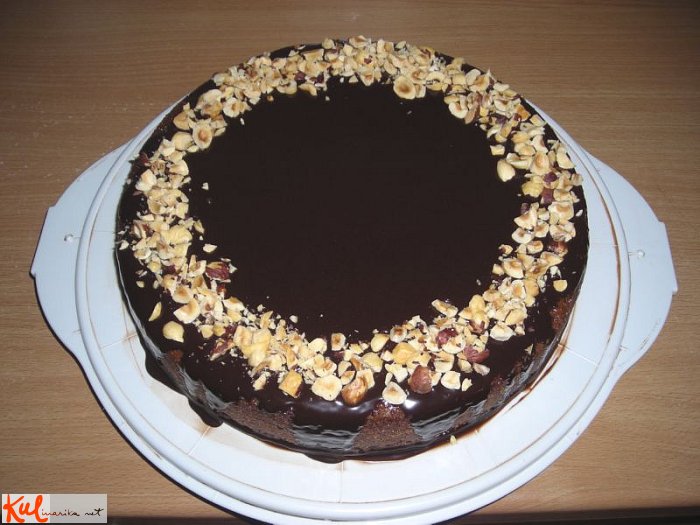 v posodi nad paro segrejemo Nutello in sladko smetano. Mešamo, da se zmes poenoti in dodamo rum. Pustimo na sobni temperaturi, da se malo zgosti. Polijemo ga po površini torte in z nasekljanimi lešniki okrasimo rob.