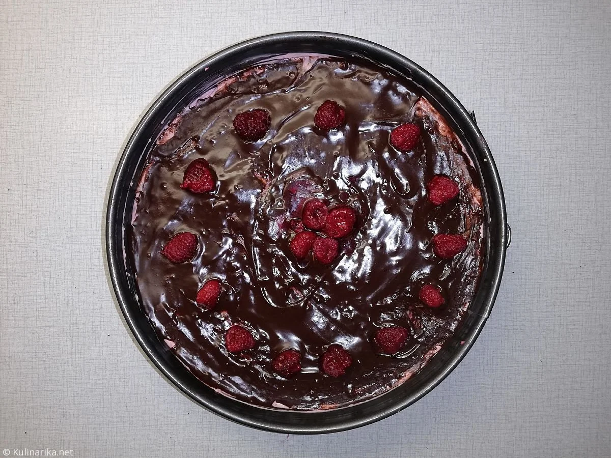 4. Čokolado stopimo, dodamo ji nekaj stopljenega masla (kokosovega) in jo prelijemo čez torto. Okrasimo z malinami in torto postavimo čez noč v hladilnik.