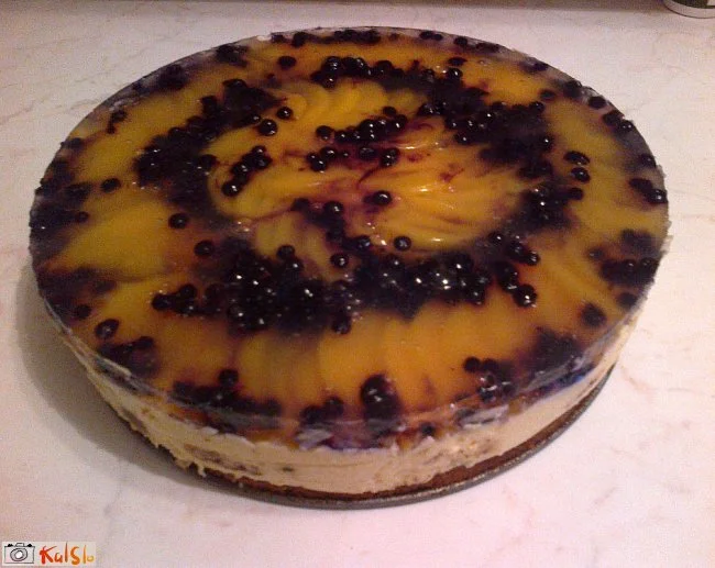 Na kremo nadevamo - zložimo narezano sadje (breskve in borovnice) in prelijemo s tortnim prelivom, ki ga skuhamo v soku od breskev. Sladico damo na hladno za cca. 30 minut, da se vse ohladi in strdi.