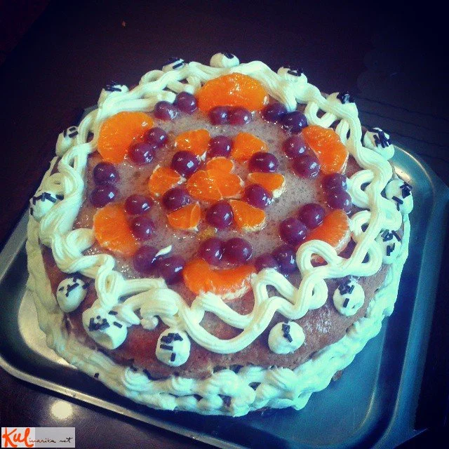 Biskvit namočimo s sokom breskev in češenj. Stepemo eno vrečko šlag kreme z okusom čokolade in jo namažemo na spodnji del biskvita, kamor po vrhu damo še narezane češnje. Nadev pokrijemo z biskvitom in tudi tega namočimo s sokom. Zopet stepemo eno vrečko šlag kreme z okusom čokolade in jo namažemo po biskvitu. Na kremo damo narezane breskve in vse skupaj pokrijemo z zadnjo plastjo biskvita. Tudi zgornji del namočimo s sokom ter po želji dekoriramo s sadjem. Po sadju še polijemo želatino in počakamo, da se strdi. Ko se želatina ohladi, stepemo sladko smetano in po želji dekoriramo okrog torte. Lahko nanesemo tudi čokoladne mrvice.