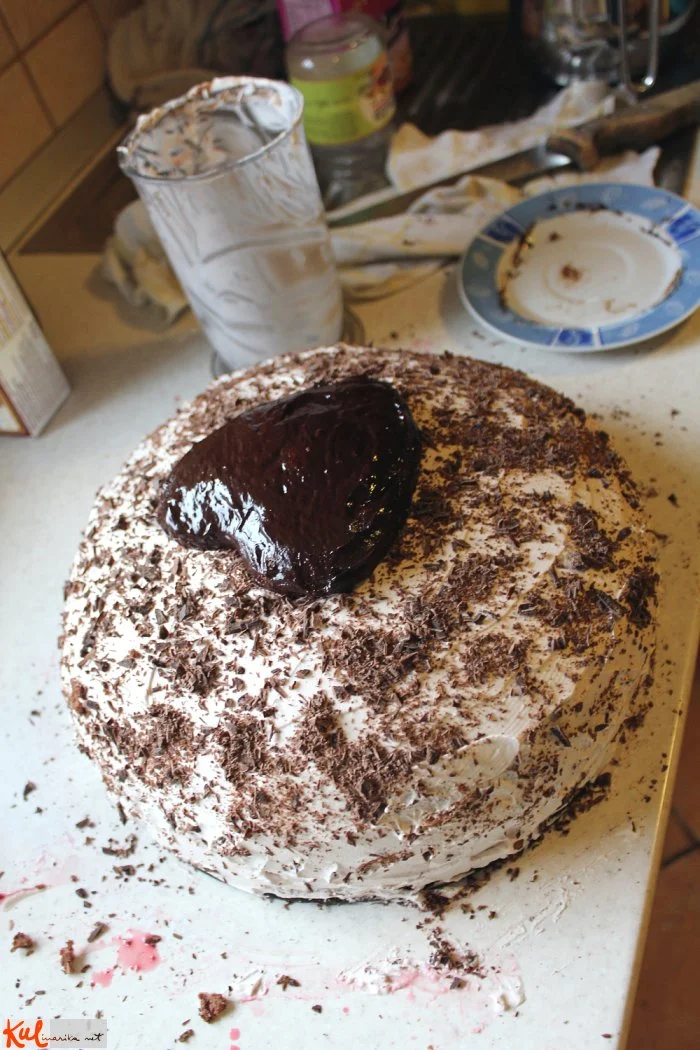 Spečen biskvit pustimo, da se na sobni temperaturi ohlaja približno pol ure. Med tem časom narežemo banano na tanke kolobarje ter sok iz višnjevega kompota zmešamo s 5 žlicami ruma. Skuhamo pa tudi čokoladen puding, v katerega prav tako zmešamo 5 žlic ruma ter ga pustimo ohlajati na sobni temperaturi.