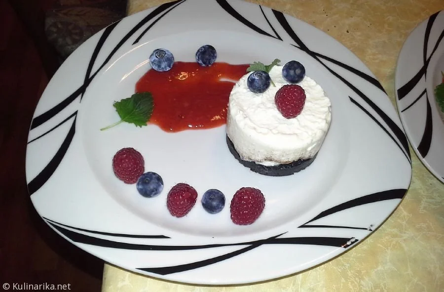 5. Serviramo žlico jagodne omake in skutino tortico, krožnik pa poljubno okrasimo s svežim sadjem.
