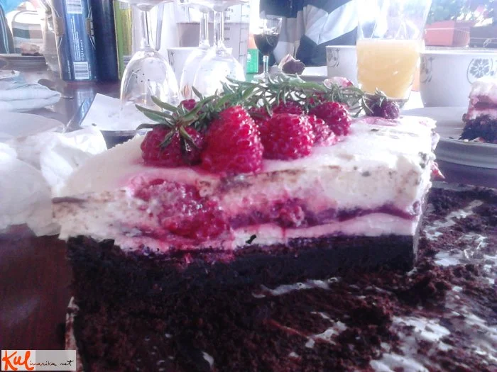 torta brez moke, z mascarpone nadevom in malinovim prelivom