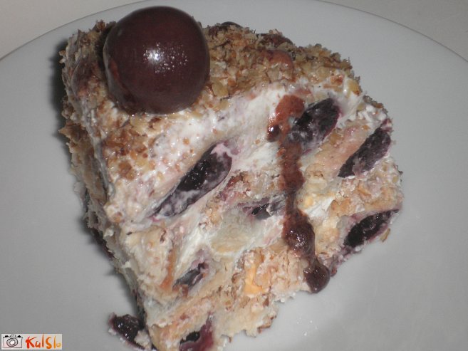 V okroglo skledo (recimo za solato) postavimo narezane cevke, jih prekrijemo najprej s smetanovim prelivom in nato z mletimi orehi. Postopek ponovimo, dokler nam ne zmanjka cevk iz listnatega testa. Seveda prekrijemo tudi zadnji "oblat" s prelivom in orehi. Skledo pokrijemo in jo damo v hladilnik za približno 12 ur. Nato skledo obrnemo na ustrezen krožnik/pladenj, potresemo lepo z orehi in okrasimo po želji (tudi nekaj preostalih višenj je dovolj). Naj vam tekne!