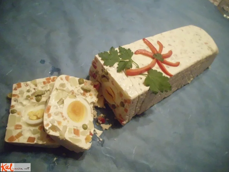 Pekač (30x11 cm) obložimo s prozorno folijo za živila in vlijemo polovico mase. Po masi zlagamo olupljena in cela kuhana jajca, enega zraven drugega. Prilijemo še ostalo maso in po vrhu poravnamo z žlico.