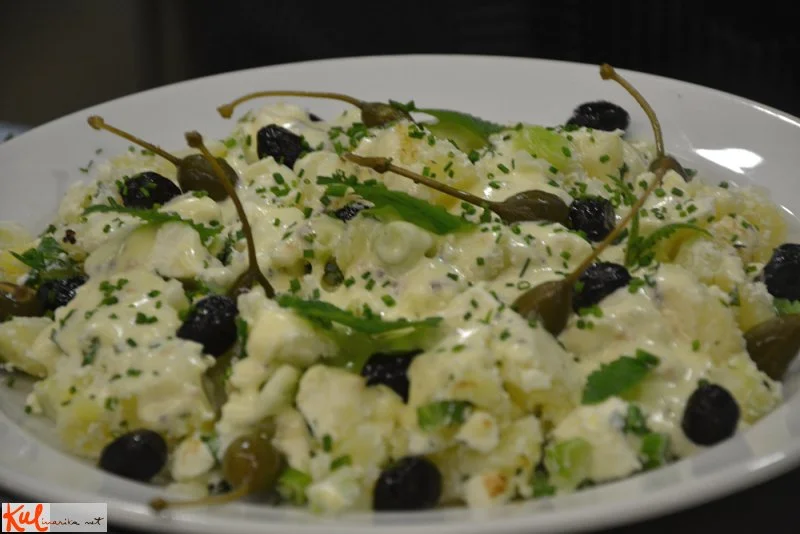 Krompir skuhamo in še vročega olupimo ter zrežemo na rezine. Feto narežemo na kocke, čebulo drobno sesekljamo, z zelenim delom vred. V skledi previdno premešamo krompir (z drugimi sestavinami ga zmešamo, ko je še topel), na kocke narezano feto, olive, kapre in čebulo, solimo in popramo.