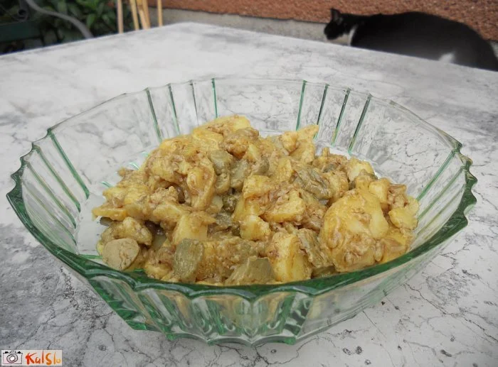 Mariniran krompir poskusimo; če je premalo kisel, ga prelijemo z mešanico kisa in gorčice, drugače pa gorčico zmešamo z nekaj žlicami juhe, če je treba, posolimo in po okusu popramo. S tem prelijemo krompir, dodamo še narezane kumarice in žlico kaper in previdno premešamo.