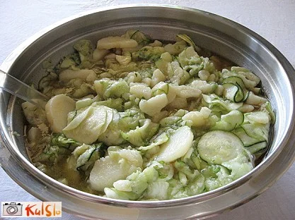 Kumarice olupimo in nalistamo na tanke rezine, prav tako cukete, vendar jih ne lupimo. Čebulo narežemo na tanke kolute.