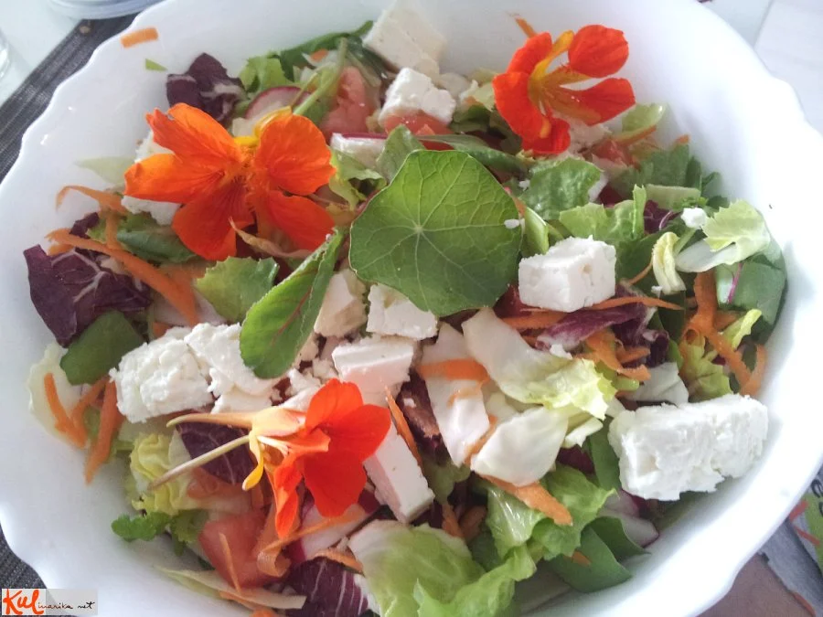 2. Radič, endivijo in zelje operemo, zrežemo na grižljaj velike koščke, zelje na ozke trakove, korenček olupimo in z ribežem naribamo na srednje trakce, dodamo v skledo, redkvice operemo in jih narežemo na rezine, por očistimo, narežemo na tanke kolobarje, operemo liste in cvetove kapucinke in jih dodamo solati, operemo lističe rdeče pese in jih dodamo, paradižnik operemo in položimo celega v solato oz. da počaka, in ga narežemo po solati tik pred serviranjem na manjše kocke. Skledo damo v hladilnik.