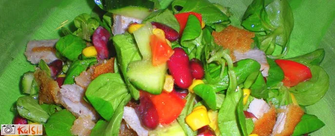 V skledo položimo motovilec, koruzo, fižol, paradižnik, kumaro ter potresemo z naribano limonino lupino. Posolimo, dodamo še jabolčni kis, olivno olje, sok ene limone, česen ter narahlo premešamo. Ocvrte svinjske zrezke narežemo na manjše kocke, dodamo narejeni solati, narahlo premešamo in vse skupaj nato položimo v servirno posodo.
