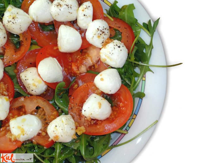 No prav dosti drugačna ni ta solata, so že tudi tu recepti kombinacije paradižnika in mozarelle, le da je dodana še rukola. Kombinacij je veliko, pri tej pa je mogoče fajn dodati še malenkost limoninega soka, ker gre super skupaj z rukolo.