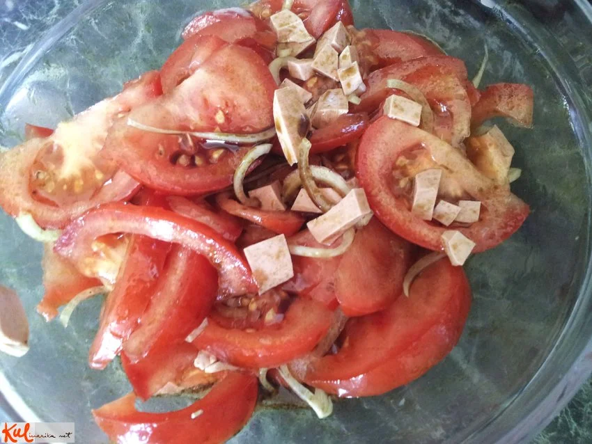 Pri solati je pomembno zaporedje postopka mešanja, bučno olje je (skupaj s paradižnikom) glavni element te solate.