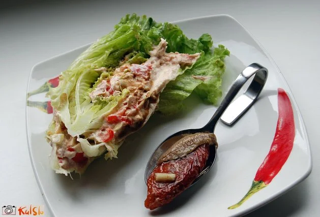 Postopoma polnimo solatno glavico, jo zavijemo v folijo in postavimo za kako urico v hladilnik.