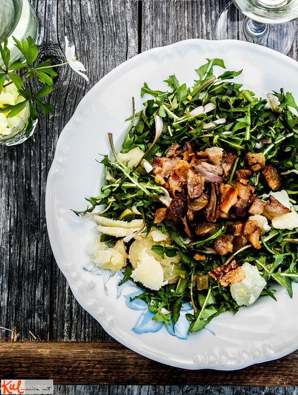 Jaz pa brskam po travniku kot kakšna koklja in iščem majhne in sveže listke, ki so seveda brez cveta (bisvetno boljše kot pri že cvetočih rastlinah). Res, da se je treba kar potrudit pri iskanju in potem še pri čiščenju, ampak se izplača. Solato delam na točno tak način, le kis mora biti obvezno domač, iz terana. Božansko!!