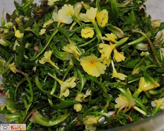 Regratova solata s trobenticamisvež pomladanski regrat s trobenticami in olivnim oljem