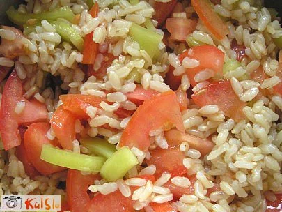 Kar toplemu rižu dodamo narezan paradižnik in papriko. Po okusu posolimo in prilijemo bučno olje.