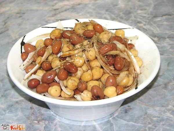 V posodo damo čičerko, fižol in sesekljano čebulo. Iz ostalih sestavin zmešamo omakico in vse skupaj zmešamo ter pustimo 15 minut, da se sestavine prepojijo.