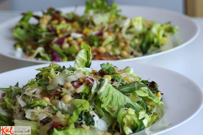 Sestavine očistimo in narežemo v veliko posodo za mešanje. Solimo, malo popramo, naredimo dva kroga olivnega olja- tanek curek, tri kroge balzamičnega kisa, dve- tri žlice jogurtovega preliva z zelišči (tega imam vedno v hladilniku). Poskusimo in po želji dodamo začimbe.