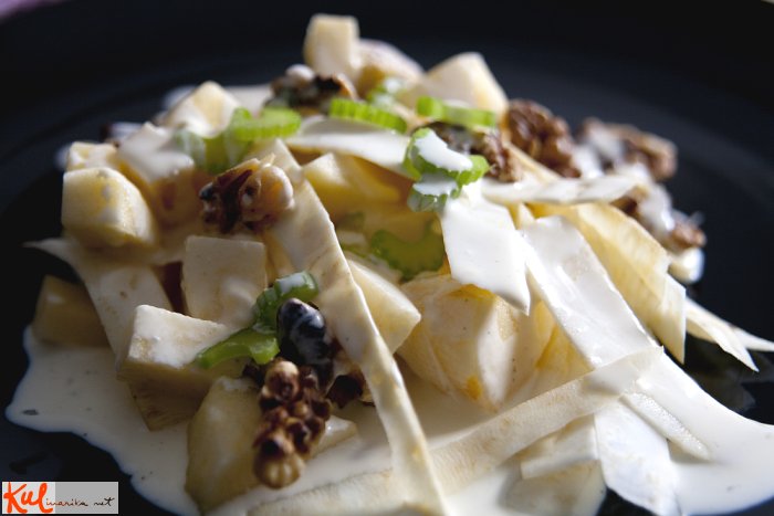 V skledi zmešamo naribano zeleno, narezana jabolka in zdrobljene orehe, dodamo majonezo in kislo smetano, solimo in popramo ter vse skupaj rahlo, a temeljito premešamo. Po želji dodamo nekaj kapljic limoninega soka ali majhno žličko vina.