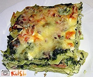 Naložimo plast testenin, jih prelijemo s tekočo zmesjo, špinačo, pršutom in koščki skute, nato zopet s testeninami, tekočo zmesjo, špinačo, pršutom in skuto. Na koncu naribamo še sir po želji.