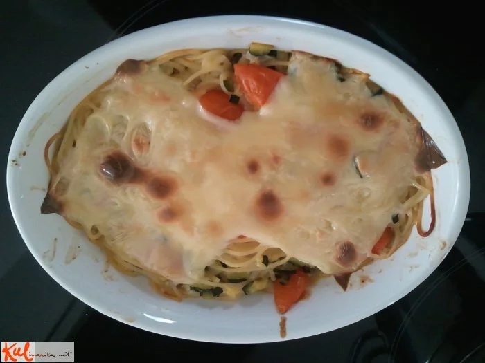 Tako pripravljeno omako zlijemo na odcejene špagete, pomešamo in na malem ognju grejemo pb. 3 minute, da testenine vpijejo nekaj omake.