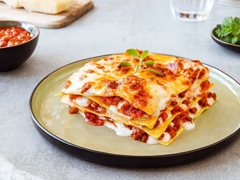 Pekač namasti z maslom in dno prekrij s prvo plastjo bolonjske omake in bešamela, nadaljuj s plastjo listov lazanje, te pa nato prekrij z drugo plastjo bolonjske omake in bešamela.