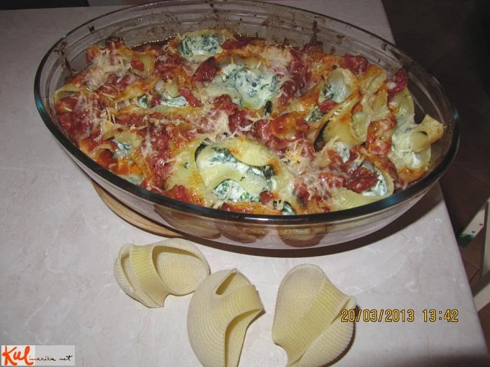 4Lumacone skuhamo nekoliko čez polovico in odcedimo. Špinačo skuhamo in grobo sesekljamo. Ohlajeno premešamo z ricotto. Solimo, popramo, dodamo nariban parmezan. Z žličko napolnimo lumacone.