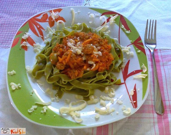 Najprej si pripravimo sestavine: iz mesa oblikujemo približno centimeter debele kroglice popolne oblike, nasekljamo čebulo, naribamo korenje in sir, pojemo 3 olive in segrejemo malo olivnega olja v manjši posodi. Na segretem olju prepražimo čebulo in ko je le ta prepražena, dodamo mesne kroglice in jih pečemo približno 7 minut in pol, da dobijo sivo barvo in ne razpadejo. V posodo dodamo še korenje in po 5 minutah še žlico paradižnikovega koncentrata ter pražimo še kako minuto ali tri. Vmes seveda previdno mešamo. Po minuti ali treh zalijemo z malo vode izpod pipe in dodamo vse zgoraj navedene začimbe in še ostalih 6 oliv. Zdaj pristavimo osoljeno vodo izpod pipe v večji lonec, kjer bomo skuhali špinačne rezance. Omako kuhamo še kakih 20 minut, vmes zmerno mešamo vsake 3 minute saj nočemo, da se nam prismodi, vodo pa dodajamo po potrebi, da dosežemo ali vzdržujemo želeno gostoto. Po 20 minutah so tako makaroni kot omaka pripravljeni, zato lahko serviramo na krožnik, na katerega potresemo vsaj 2 žlici naribanega sira, saj sir popestri okus.