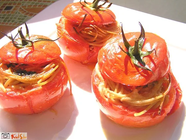 Vse premešamo in začnemo s polnjenjem paradižnikov. Špagete zvijamo s pomočjo vilice