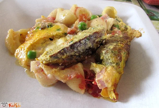 Odcedimo kuhano pašto, jo dodamo k zelenjavi in dobro premešamo, nato pa pretresemo v globok pekač (cca. 25 x 30), ki smo ga pred tem malo namastili. Posujemo z naribanim sirom in tu pa tam položimo kako žličko kisle smetane. Postavimo v že ogreto pečico (180 stopinj) in pečemo približno 7 - 8 minut, nato vzamemo iz pečice, prelijemo z mešanico razžvrkljanih jajc, soli, popra in rastlinske smetane ter vrnemo v pečico še za približno 15 minut.