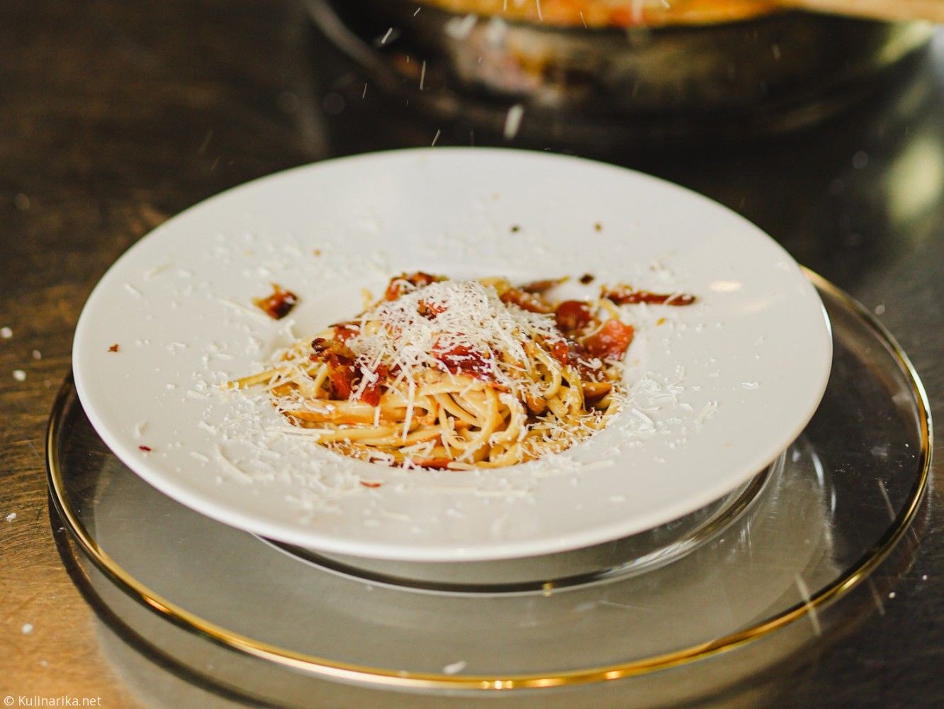 Pašto odcediš. Vržeš v ponev s pripravljeno omako. Premešaš na malem ognju, da se vse skupaj ne shladi.