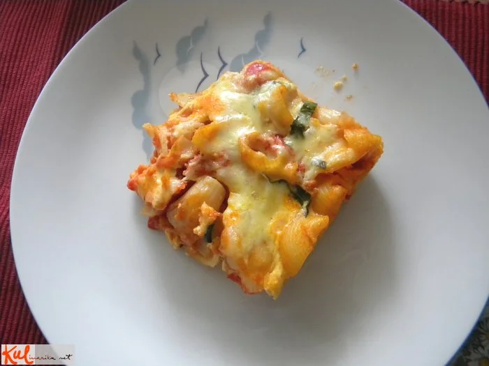 V pripravljeno omako damo kuhane testenine, premešamo in stresemo v pekač.