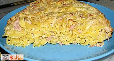 Ločimo rumenjake in beljake. Iz beljakov naredimo trd sneg, ki ga umešamo na koncu, predno damo v pekač. Rumenjake posebej zmešamo, dodamo sol, kislo smetano in šunko, ki smo jo narezali na enako široke trakove, kot so rezanci. Masa je pripravljena.