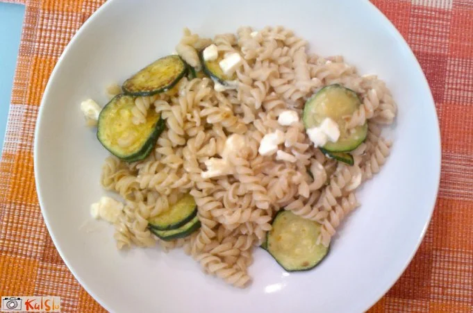 Po navodilih skuhamo testenine. Medtem narežemo pol bučke na tanjše kolobarje, ki jih popečemo v ponvi na olivnem olju. Pečemo jih prib. 5 minut (ali manj), vmes jih obračamo in mešamo. Ko so bučke popečene, ugasnemo štedilnik in v ponev dodamo odcejene testenine, zatem pa feto, ki smo jo narezali na manjše kvadratke. Prib. pol minute mešamo (da se feta malo razpusti). Po želji začinimo s poprom.